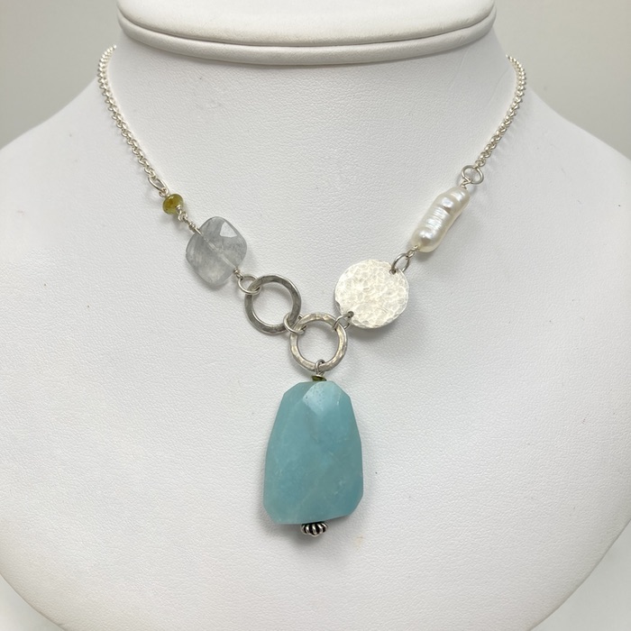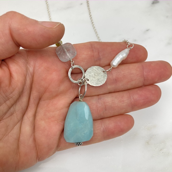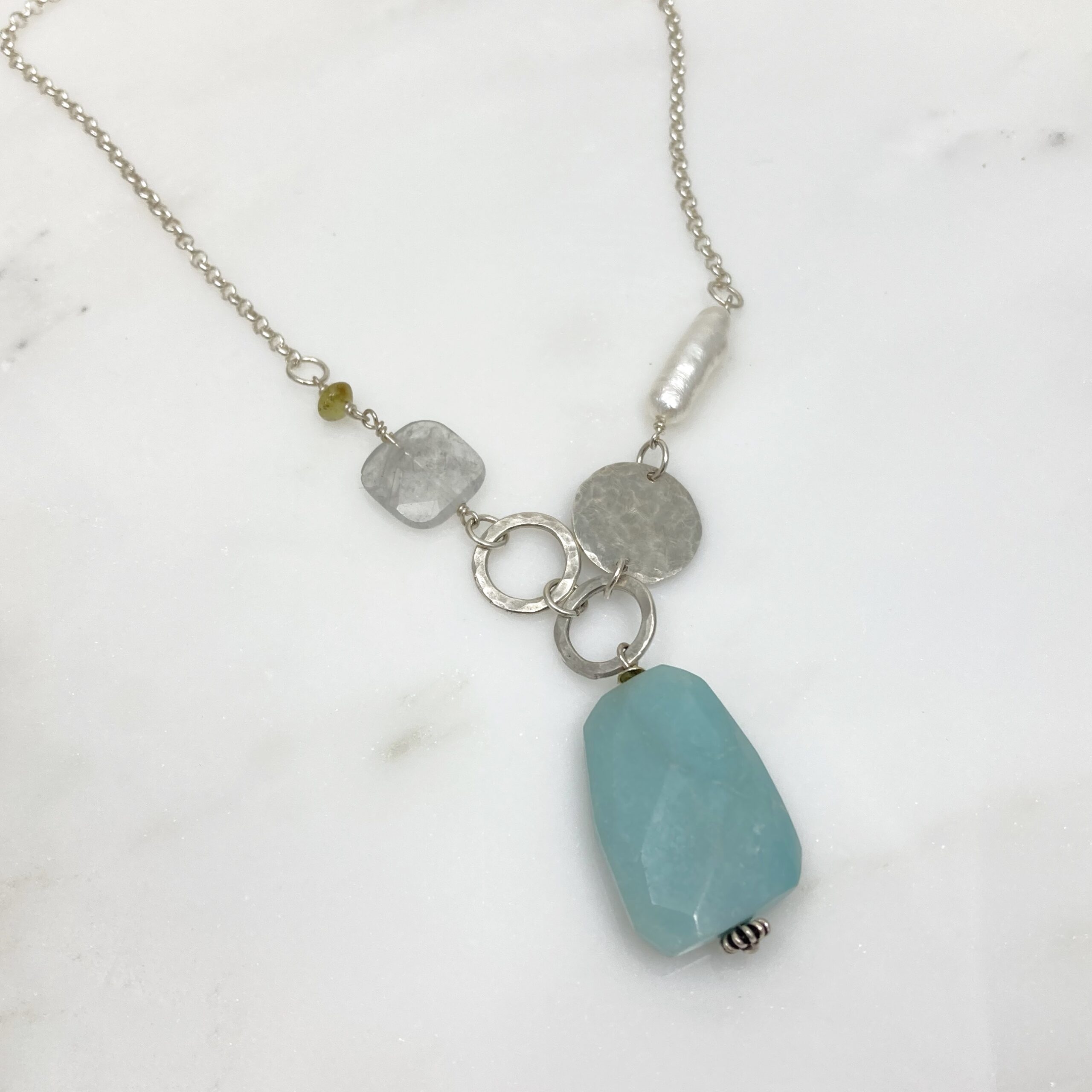 From the Seashore collection, faceted amazonite pendant with faceted square tourmaline, peridot, freshwater pearl and sterling accents on a sterling chain. Pendant stone is 2.5cm (1 inch); total length including pendant is 66cm (26 inches).