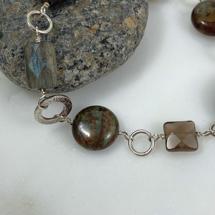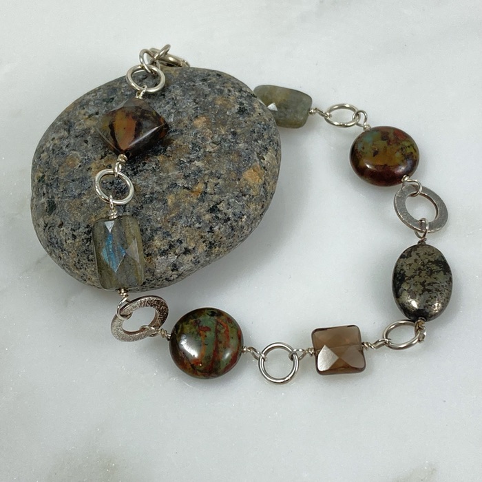 Puff coin rhyolite (rainforest jasper) faceted diamond silver leaf jasper, rectangular faceted Labradorite, puff oval pyrite, faceted square smoky quartz and sterling bracelet. 19cm (7.5 inches) long.