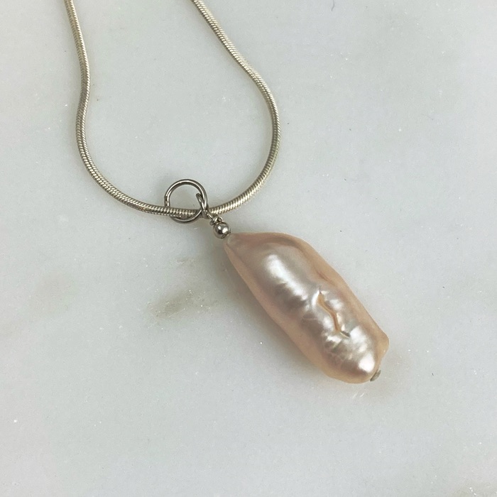 Pink biwa pearl Solo pendant on a 24″ / 61cm sterling snake chain. The pearl measures 2.3cm (7/8 inch) long.