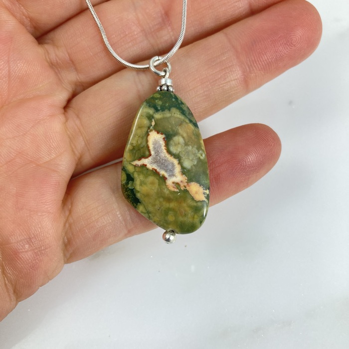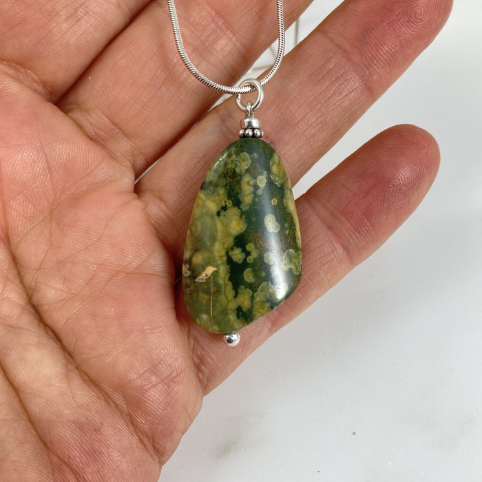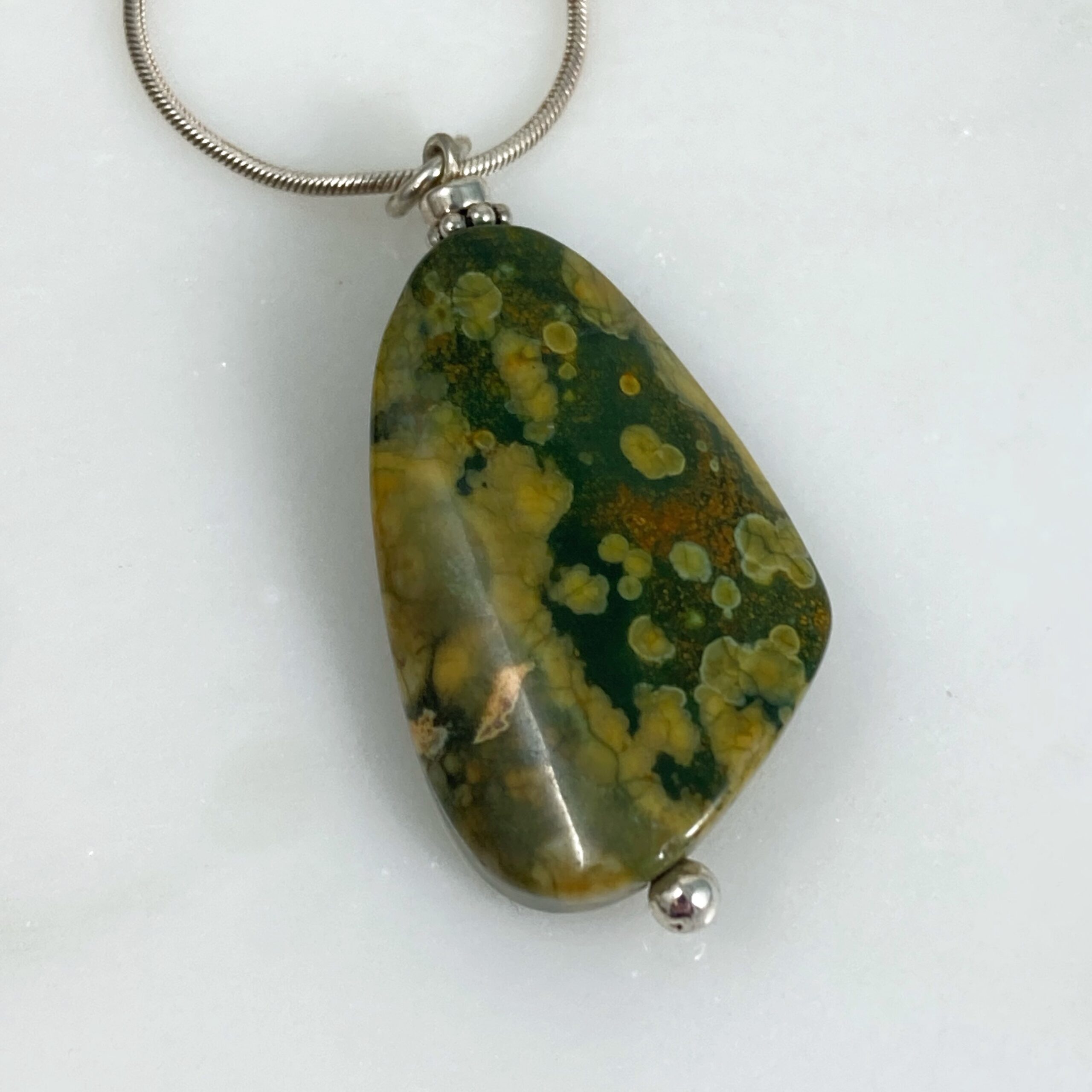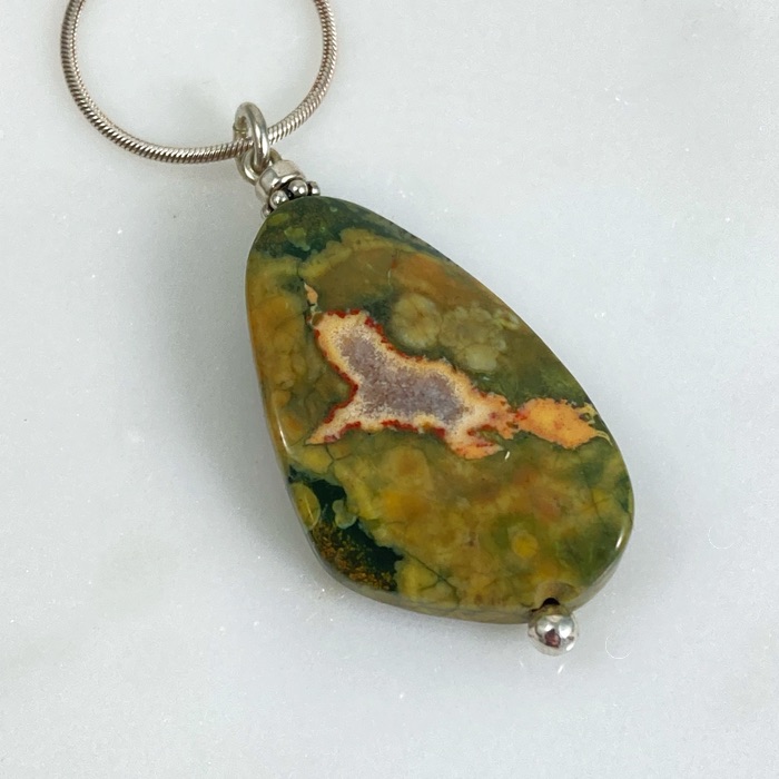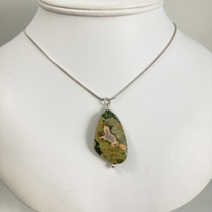 Asymmetrical wave-shaped rhyolite pendant on a 61cm (24-inch) sterling snake chain. Also called rainforest jasper, the stone shows fascinating pattern variants on either side. The pendant is 4.5cm (1.5 inches) long.