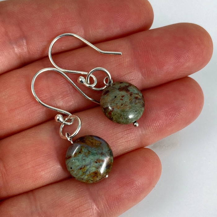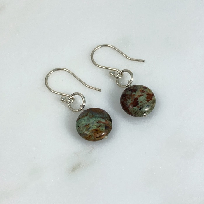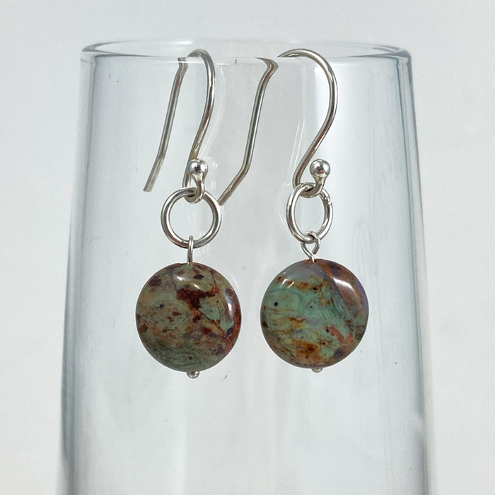 From the Breeze collection: puff coin rhyolite (rainforest jasper) earrings on sterling ear wires in shades of grey-green and browns. Earring dangle 2cm (7/8 inch).